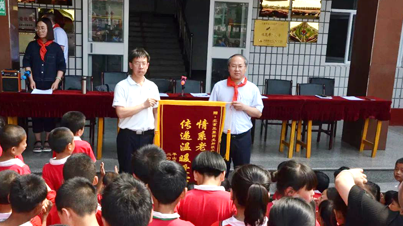 Subsequently, Hebei High-Tech Enterprise Association, Hebei Science and Technology Enterprise Incubation Association, Beijing Sanju Sunshine Intellectual Property Agency Co., Ltd., and Hebei Rixing Law Firm donated urgently needed air conditioners, computers, and other equipment for teachers and students. Young Pioneers representatives tied bright red scarves on the leaders of the donating organizations. Vice Principal Chen Minglong presented a banner to the donors reading, “Spreading Warmth and Love, Caring for Education in Revolutionary Areas,” followed by a group photo.