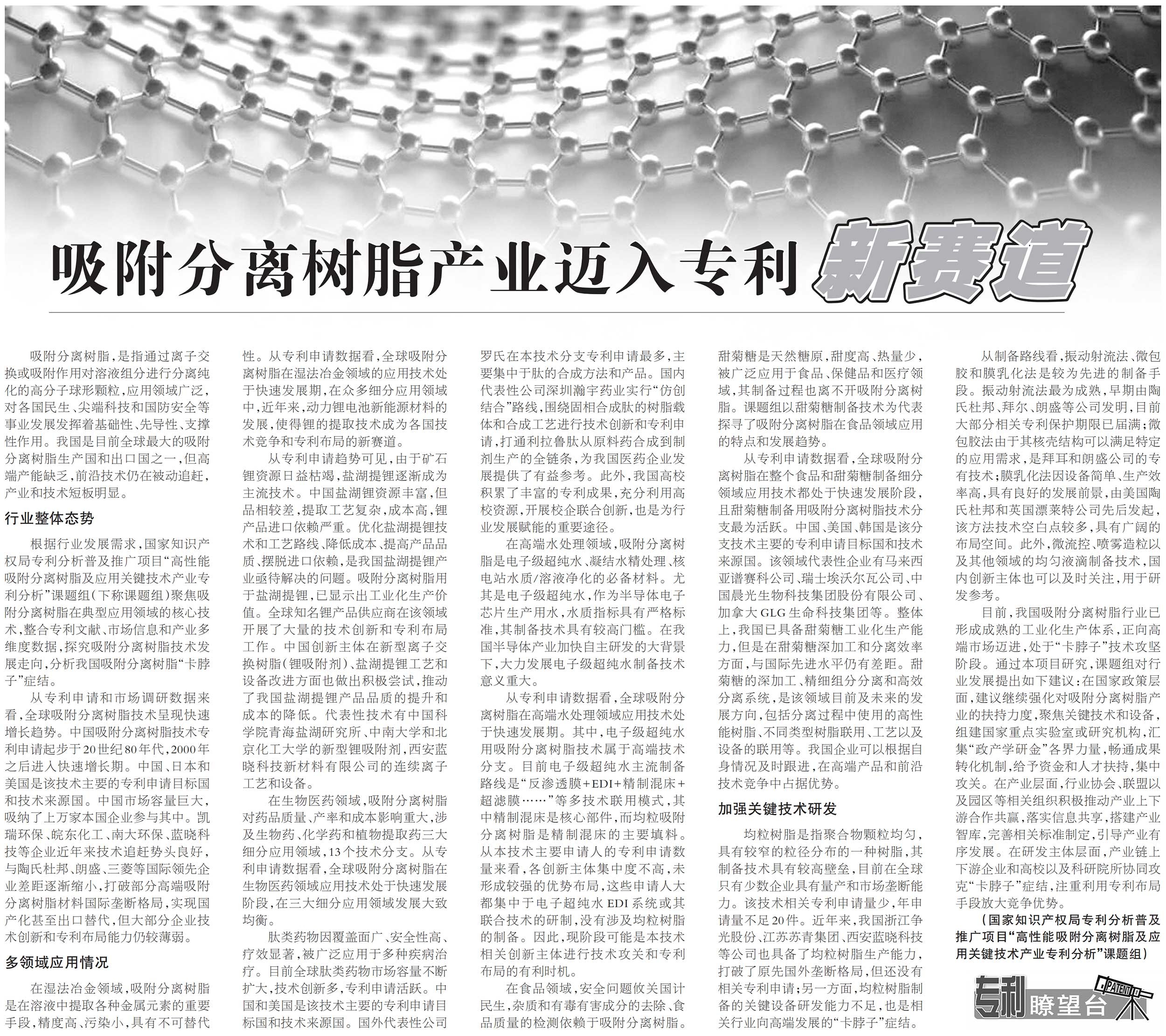 “吸附分離樹(shù)脂產(chǎn)業(yè)邁入專(zhuān)利新賽道”——《中國(guó)知識(shí)產(chǎn)權(quán)報(bào)》報(bào)道三聚陽(yáng)光研究項(xiàng)目