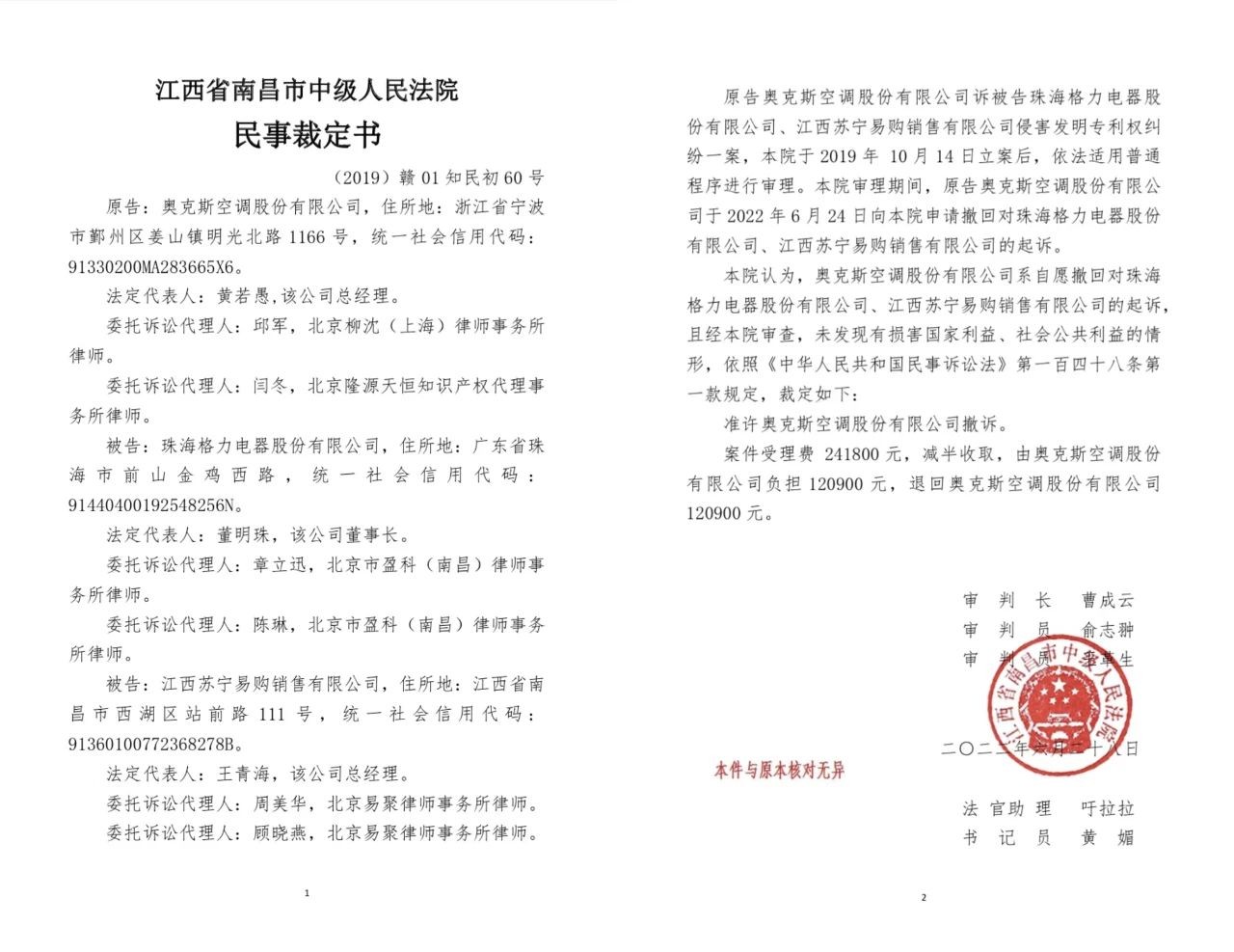 據(jù)兩件民事裁定書顯示,原告奧克斯空調(diào)股份有限公司訴被告珠海格力電器股份有限公司、江西蘇寧易購銷售有限公司侵害發(fā)明專利權(quán)糾紛一案,江西省南昌市中級人民法院于 2019 年 10 月 14 日立案后,依法適用普通程序進行審理。審理期間,原告奧克斯空調(diào)股份有限公司于 2022 年 6 月 24 日向江西省南昌市中級人民法院申請撤回對珠海格力電器股份有限公司、江西蘇寧易購銷售有限公司的起訴。