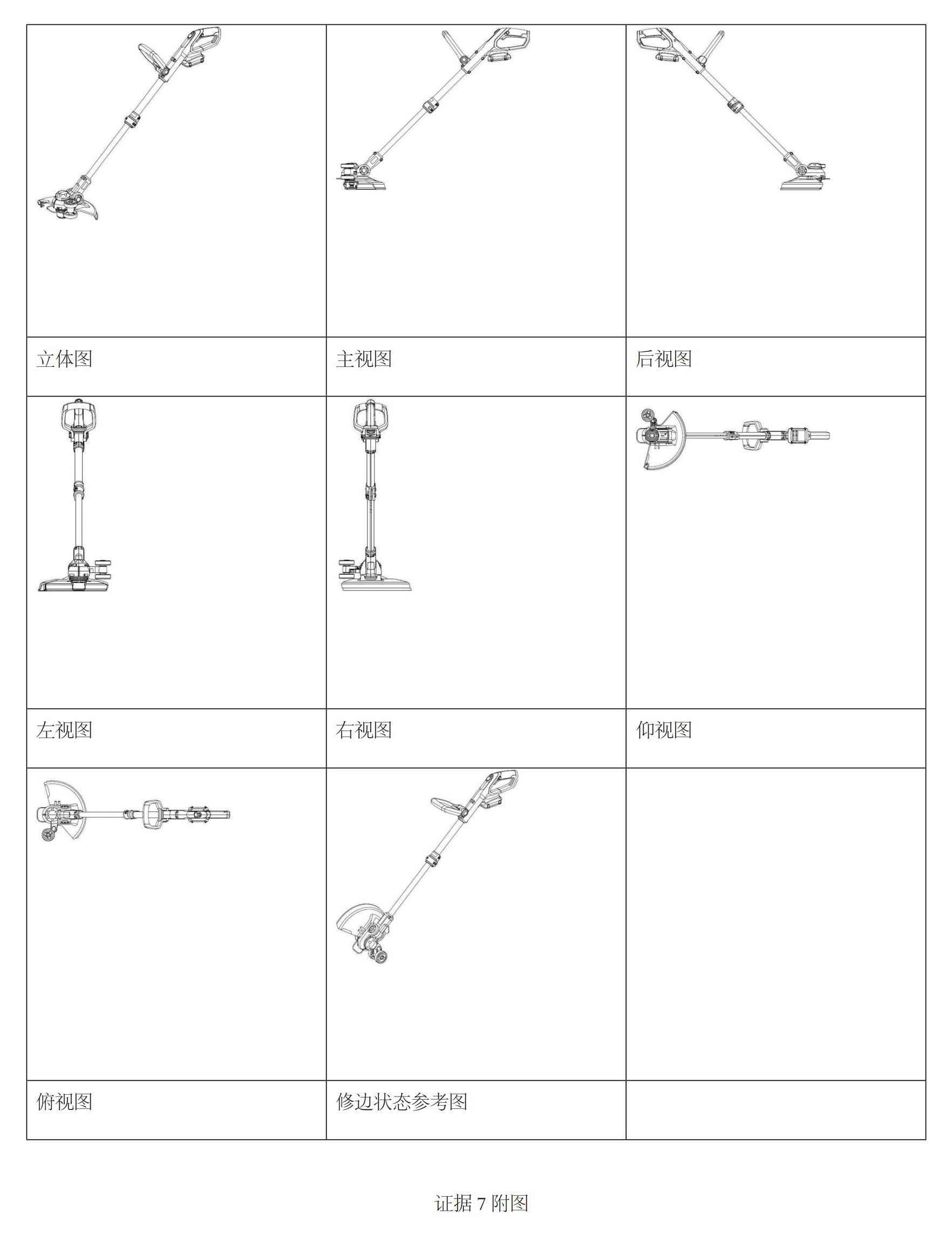 通過涉案專利與證據(jù) 7 的對(duì)比可知,兩者的整體部件組成及各部件的形狀和相對(duì)位置基本一致,上部為手柄,中間為桿體、桿體下方為電機(jī)、電機(jī)下方為鈍角扇形擋草板,二者相同點(diǎn)使得兩者給一般消費(fèi)者帶來(lái)了相似的整體視覺效果。一般消費(fèi)者經(jīng)過對(duì)涉案專利與證據(jù) 7的整體觀察可以看出,二者的差別對(duì)于產(chǎn)品外觀設(shè)計(jì)的整體視覺效果均不足以產(chǎn)生顯著影響,涉案專利與證據(jù) 7 相比不具有明顯區(qū)別,涉案專利不符合專利法第 23 條第 2 款的規(guī)定。