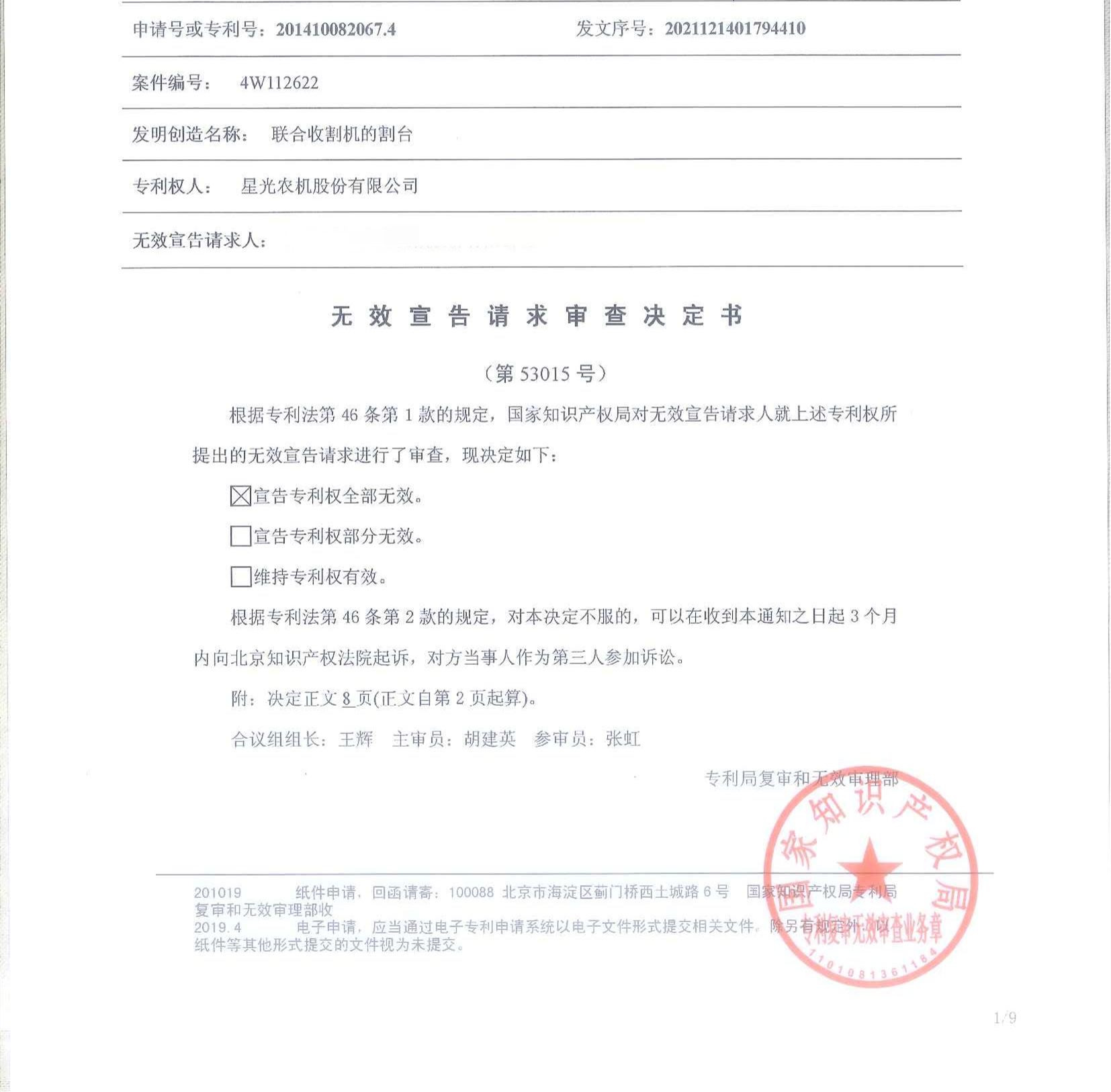在第53015號無效決定中,星光農(nóng)機(jī)擁有的第201410082067.4號“聯(lián)合收割機(jī)的割臺”專利被宣告無效。