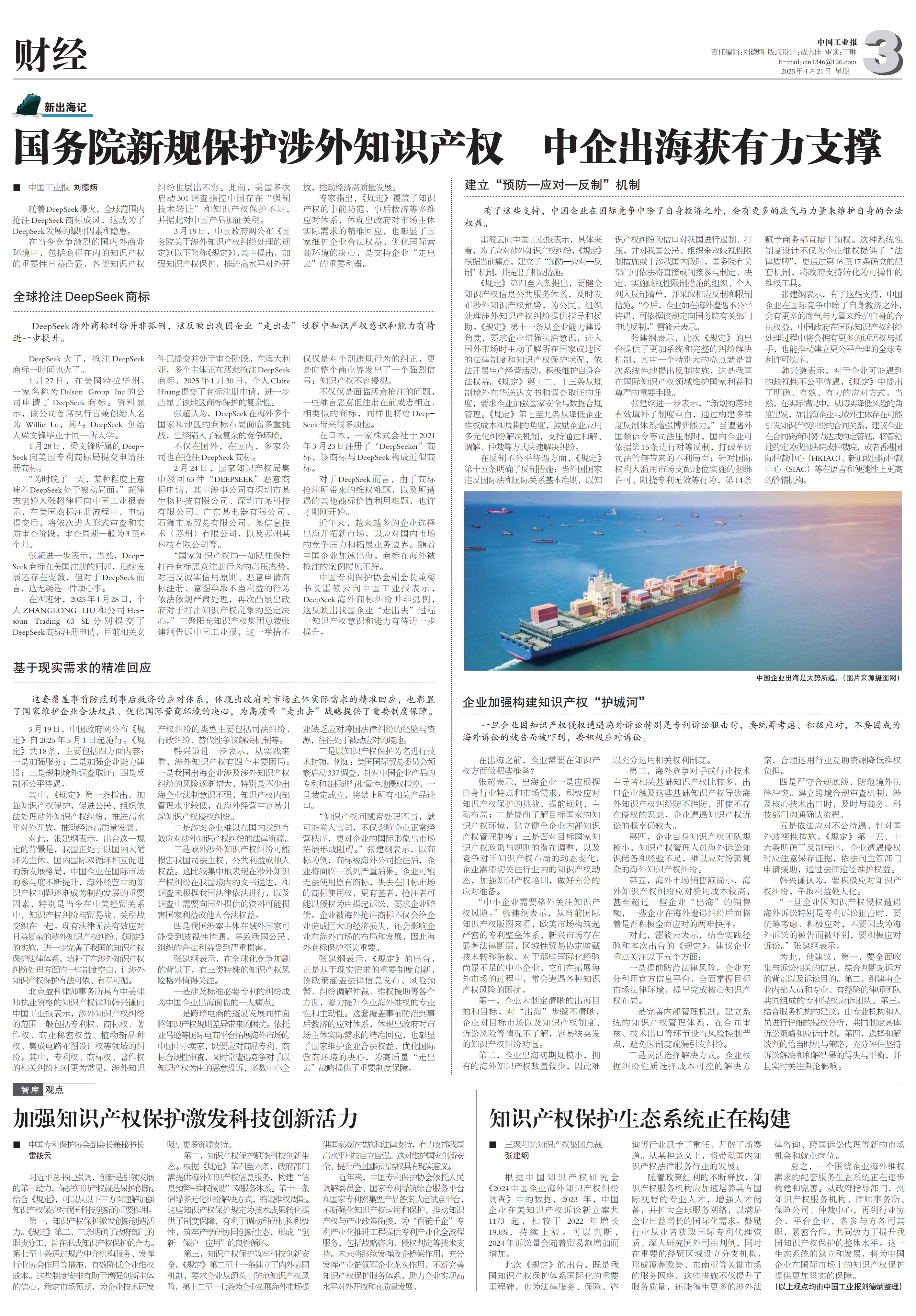 就國務(wù)院剛剛頒布的《國務(wù)院關(guān)于涉外知識產(chǎn)權(quán)糾紛處理的規(guī)定》,中國工業(yè)報獨家采訪了國家知識產(chǎn)權(quán)局運用促進司原司長雷筱蕓以及三聚陽光知識產(chǎn)權(quán)集團總裁張建綱等行業(yè)專家,行業(yè)專家首次從不同角度深度解讀,中國工業(yè)報和中國工業(yè)網(wǎng)整版報道,國家出手保駕護航,企業(yè)出海必備攻略。