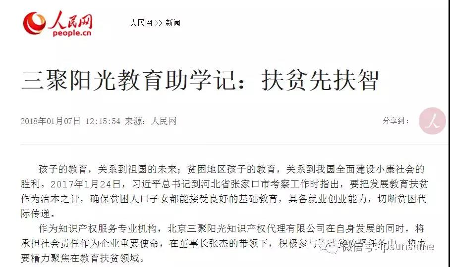 ? 扶貧濟(jì)困是中華民族的傳統(tǒng)美德,也是我國(guó)社會(huì)主義精神文明建設(shè)的重要組成部分。三聚陽(yáng)光擁有17年發(fā)展歷史,通過(guò)誠(chéng)信經(jīng)營(yíng),在知識(shí)產(chǎn)權(quán)服務(wù)工作中不斷取得新進(jìn)展。在取得可喜成績(jī)的同時(shí),公司各級(jí)領(lǐng)導(dǎo)及員工一貫高度關(guān)注社會(huì)公益事業(yè),時(shí)刻銘記公司“敬天愛人”的核心價(jià)值觀,懷揣著一份回饋社會(huì)的情懷,積極履行社會(huì)責(zé)任。1月7日,人民網(wǎng)刊發(fā)文章《三聚陽(yáng)光教育助學(xué)記:扶貧先扶智》,現(xiàn)予全文轉(zhuǎn)載,以饗讀者。