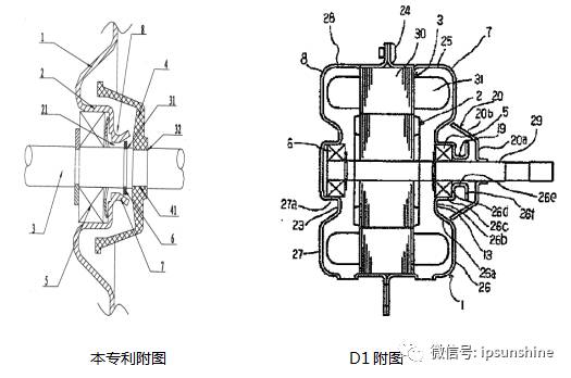 請(qǐng)求人認(rèn)為,D1中的轉(zhuǎn)軸29相當(dāng)于本專利中的轉(zhuǎn)軸3,軸承室26d相當(dāng)于本專利中的軸承室2,設(shè)置在軸承室26d內(nèi)的軸承5相當(dāng)于本專利中的軸承,安裝在轉(zhuǎn)軸29上的電機(jī)罩20相當(dāng)于本專利中的防水罩4,其與端蓋7之間具有間隙,軸承室5的外側(cè)面頂面突出的擋水凹槽19相當(dāng)于本專利中的擋水墻,并且,上述各個(gè)部件的位置關(guān)系與本專利中上述各個(gè)部件的位置關(guān)系均相同。