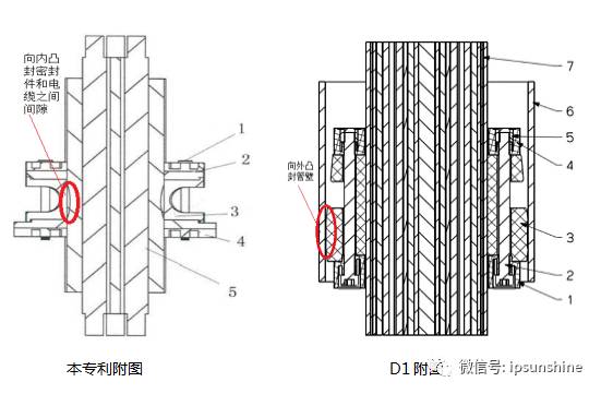 D1要解決的技術(shù)問(wèn)題為如何使線纜管封堵器用于不同直徑的線纜管道并實(shí)現(xiàn)與管壁之間的密封。具體來(lái)說(shuō),現(xiàn)有技術(shù)中由于封堵的線纜粗細(xì)不一致,管壁和橡膠結(jié)構(gòu)均會(huì)存在一點(diǎn)誤差,這導(dǎo)致安裝時(shí),容易出現(xiàn)密封不牢,或橡膠結(jié)構(gòu)塞不進(jìn)管壁情況的出現(xiàn)。對(duì)應(yīng)地,D1的解決手段是,對(duì)橡膠結(jié)構(gòu)進(jìn)行改進(jìn),采用了上下兩層結(jié)構(gòu),下層鼓狀橡膠結(jié)構(gòu)徑向向外突出而密封管壁,如D1附圖紅色標(biāo)記所示,利用橡膠結(jié)構(gòu)的不對(duì)稱,使得該結(jié)構(gòu)可以適應(yīng)不同的線纜安裝,兩者的誤差也不影響整個(gè)結(jié)構(gòu)的密封。而本專利要解決的技術(shù)問(wèn)題是實(shí)現(xiàn)封堵部件與穿過(guò)其中的電纜之間的良好密封。從D1中解決封堵器如何運(yùn)用在不同直徑的線纜管道中并實(shí)現(xiàn)管道密封的解決思路中,本領(lǐng)域技術(shù)人員并不能得到技術(shù)啟示,利用上述區(qū)別技術(shù)特征1)、2)來(lái)解決封堵器與穿過(guò)其中的線纜如何密封的問(wèn)題。